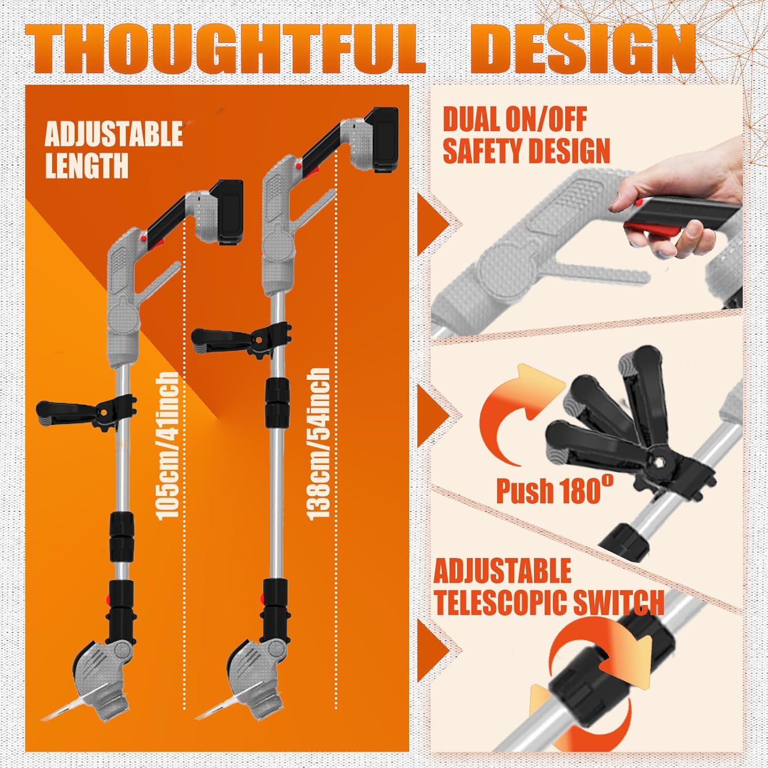 - 【Ergonomic String Trimmers Grip & Adjustable Height & Rotating Head】The battery operated weed wacker with extra labor-saving handle, you don't need to bend down. Work in the most comfortable position and greatly reduce stress on your back and waist. The adjustable telescoping pole adjusts in length from 35-55 inches to provide the length everyone needs. The no string weed wacker head angle is adjustable from 0-90°, allowing you to easily care for any hard-to-reach nooks and crannies