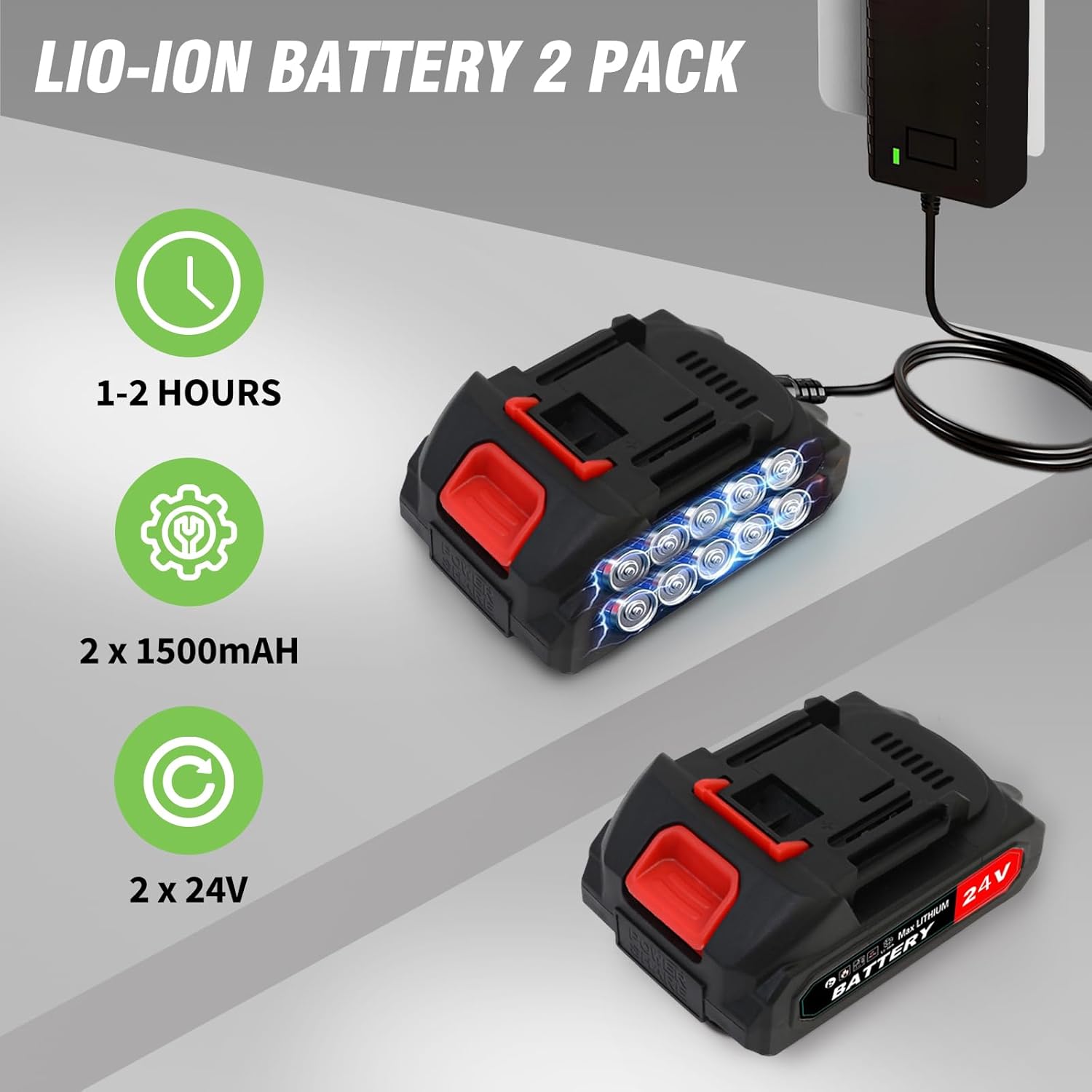 - Complete Kit with 2 Batteries & Accessories: Get everything you need in one box: 1 cordless weed wacker, 2 batteries, 2 round alloy saw blades, 10 plastic blades, 4 alloy blades, 2 wheels, 1 charger, plus 1 safety goggles and 1 pair of gloves for full protection. A ready-to-use electric weed trimmer set for hassle-free lawn care
