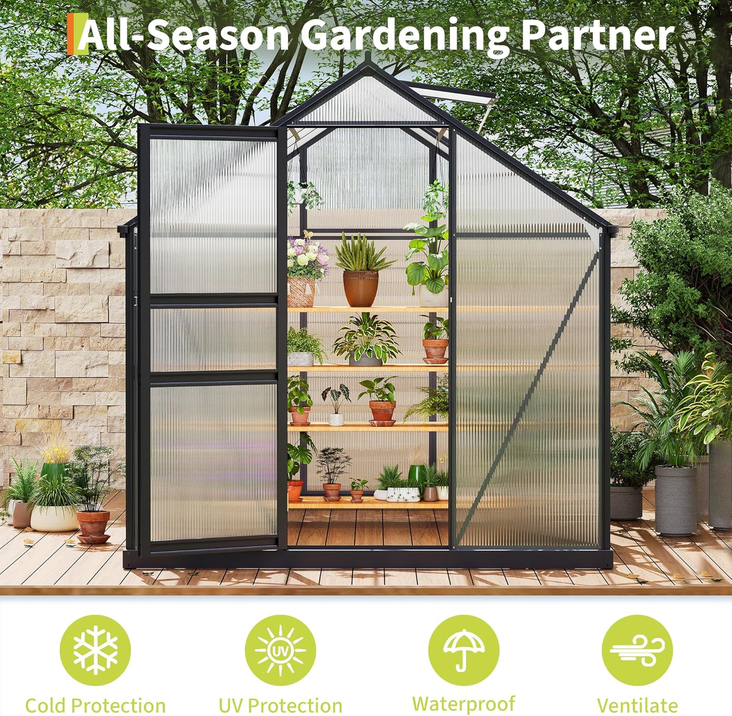 - 【Heavy-Duty & Weather Resistant Greenhouse】Built to last through storms, snow, and sun—this outdoor greenhouse features a reinforced aluminum alloy frame and ultra-durable 4mm twin-wall polycarbonate panels. Perfect for extreme climates, it resists heavy rain, strong wind, and UV damage. For extra strength, easily seal panels with glass glue. Your plants deserve a fortress!