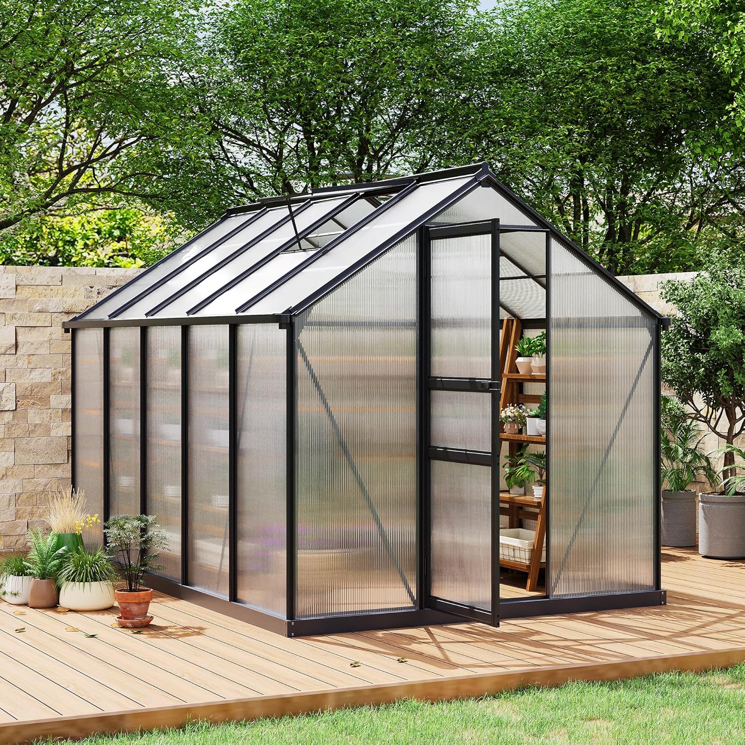 - 【Heavy-Duty & Weather Resistant Greenhouse】Built to last through storms, snow, and sun—this outdoor greenhouse features a reinforced aluminum alloy frame and ultra-durable 4mm twin-wall polycarbonate panels. Perfect for extreme climates, it resists heavy rain, strong wind, and UV damage. For extra strength, easily seal panels with glass glue. Your plants deserve a fortress!