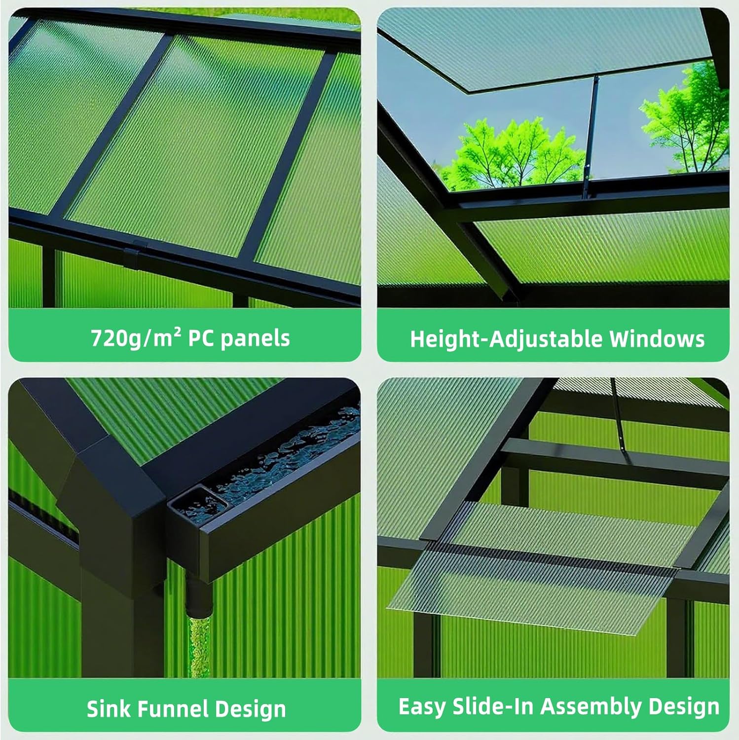 - Advanced UV-blocking protection is achieved through high-density polyethylene material that shields against harmful ultraviolet rays while optimizing sunlight diffusion for vigorous plant growth. The panels effectively regulate internal temperatures, preventing overheating in summer and retaining warmth during cooler months, maintaining an consistently ideal microclimate within your green house.